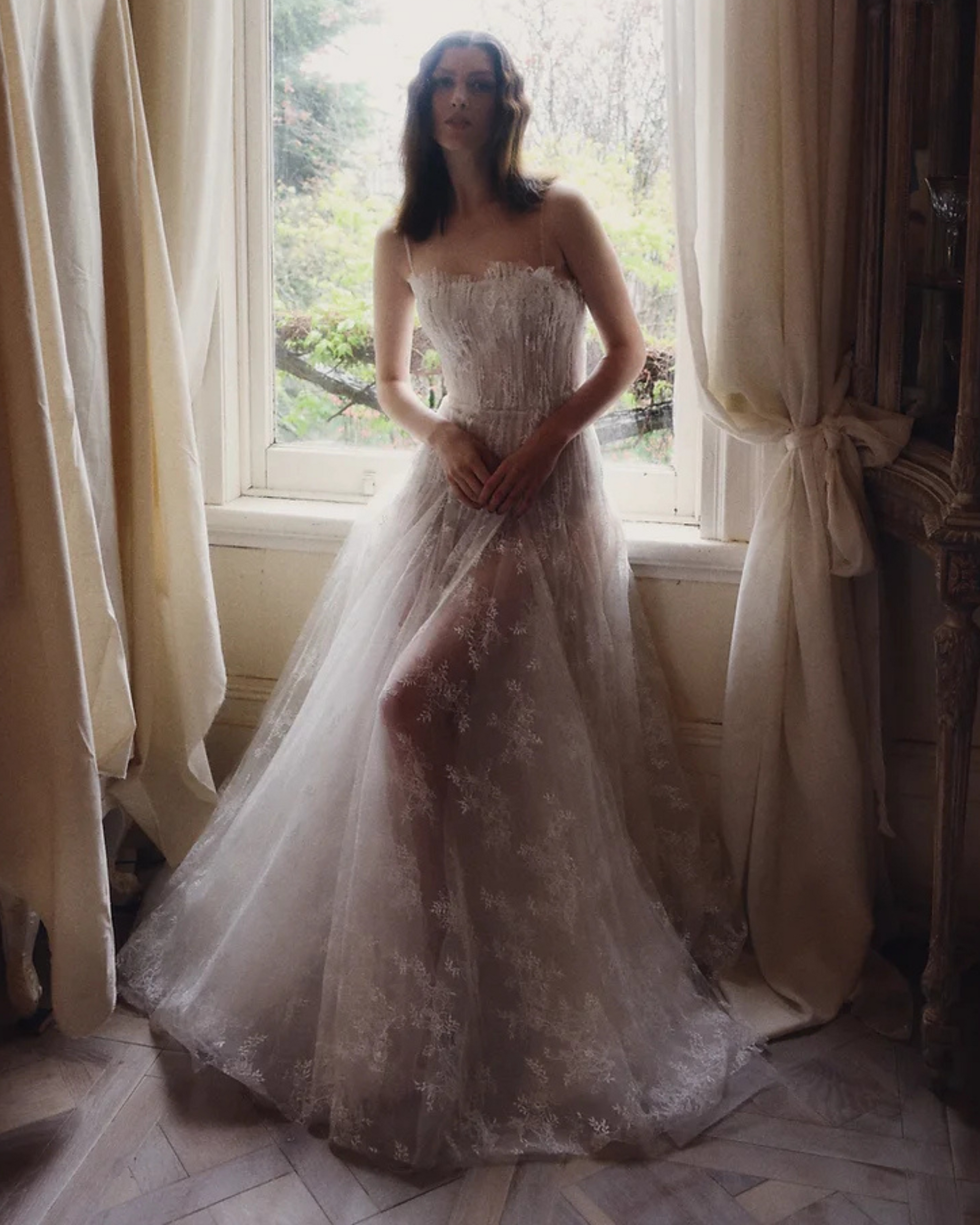 The Calla Lace Wedding Gown by FLOURE is a romantic showstopper with a modern, undone feel. This sheer ballgown features soft tulle over a dropped waist, crafted in delicate French Chantilly lace. The corseted bodice is detailed with pin-tucked stitching, adding subtle structure to the otherwise effortless silhouette.