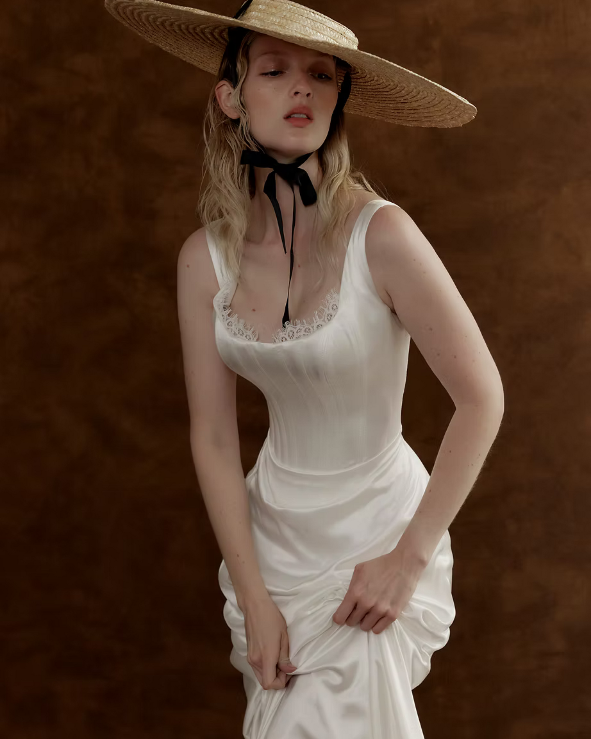 The Rue Corseted Satin Wedding Gown by Australian label FLOURE is a timeless silhouette with a refined, modern edge. Featuring a 22-panel corseted bodice designed to sculpt the waist and enhance the figure, this gown offers structure with a soft, romantic finish thanks to delicate Chantilly lace details at the neckline.